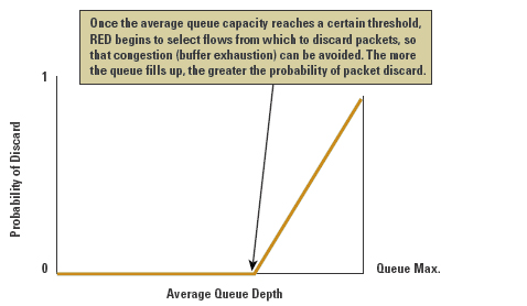 RED uses a the weighted average queue length as the probability factor for packet drop. As the average queue length increases, the probability of a packet being dropped, rather than being queued, increases. As the queue length decreases, so does the packet-drop probability (see Figure 10). Small packet bursts can pass through a RED filter relatively intact, while larger packet bursts will experience increasingly higher packet-discard rates. Sustained load will further increase the packet-discard rates. This implies that the TCP sessions with the largest open windows will have a higher probability of experiencing packet drop, causing a backoff in the window size.