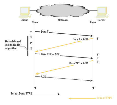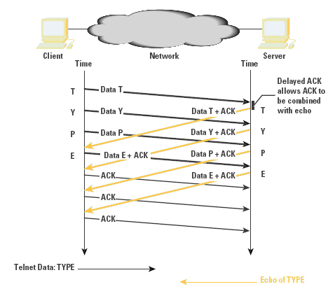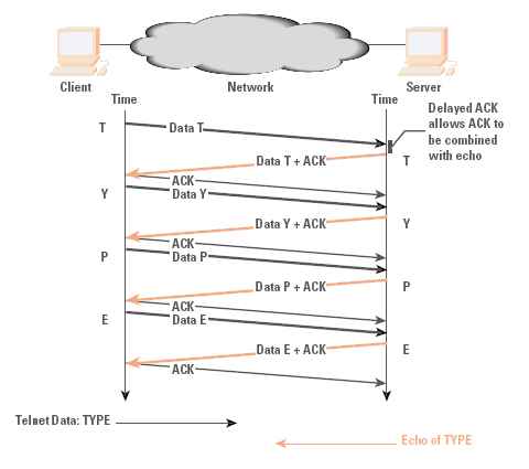 Interactive protocols are typically directed at supporting single- character interactions, where each character is carried in a single packet, as is its echo. The protocol interaction to support this is indicated in Figure 3. These 2 bytes of data generate four TCP/IP packets, or 160 bytes of protocol overhead. TCP makes some small improvement in this exchange through the use of piggybacking, where an ACK is carried in the same packet as the data, and delayed acknowledgment, where an ACK is delayed up to 200 ms before sending, to give the server application the opportunity to generate data that the ACK can piggyback. The resultant protocol exchange is indicated in Figure 4.