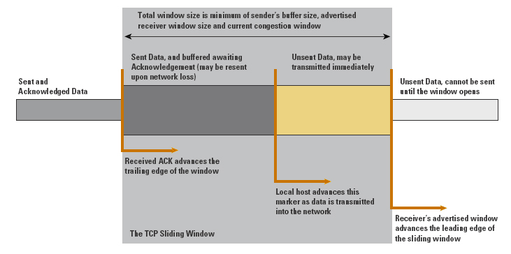 TCP uses a sliding-window protocol to support bulk data transfer (Figure 7). The receiver advertises to the sender the available buffer space at the receiver. The sender can transmit up to this amount of data before having to await a further buffer update from the receiver. The sender should have no more than this amount of data in transit in the network. The sender must also buffer sent data until it has been ACKed by the receiver. The send window is the minimum of the sender’s buffer size and the advertised receiver window. Each time an ACK is received, the trailing edge of the send window is advanced. The minimum of the sender’s buffer and the advertised receiver’s window is used to calculate a new leading edge. If this send window encompasses unsent data, this data can be sent immediately.