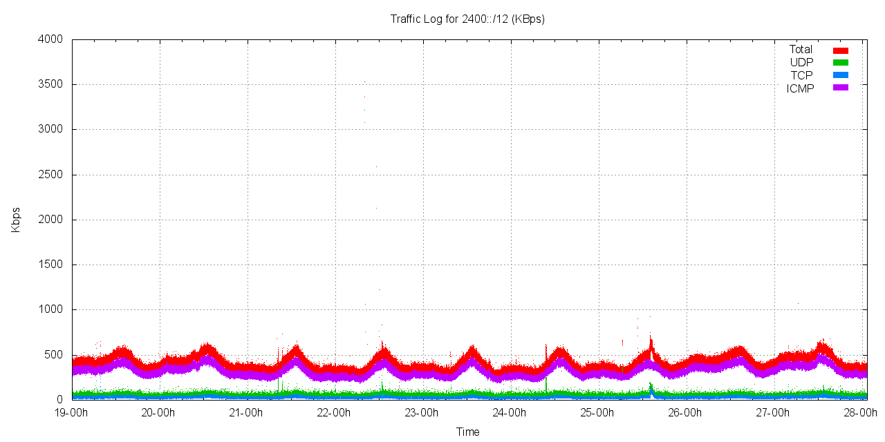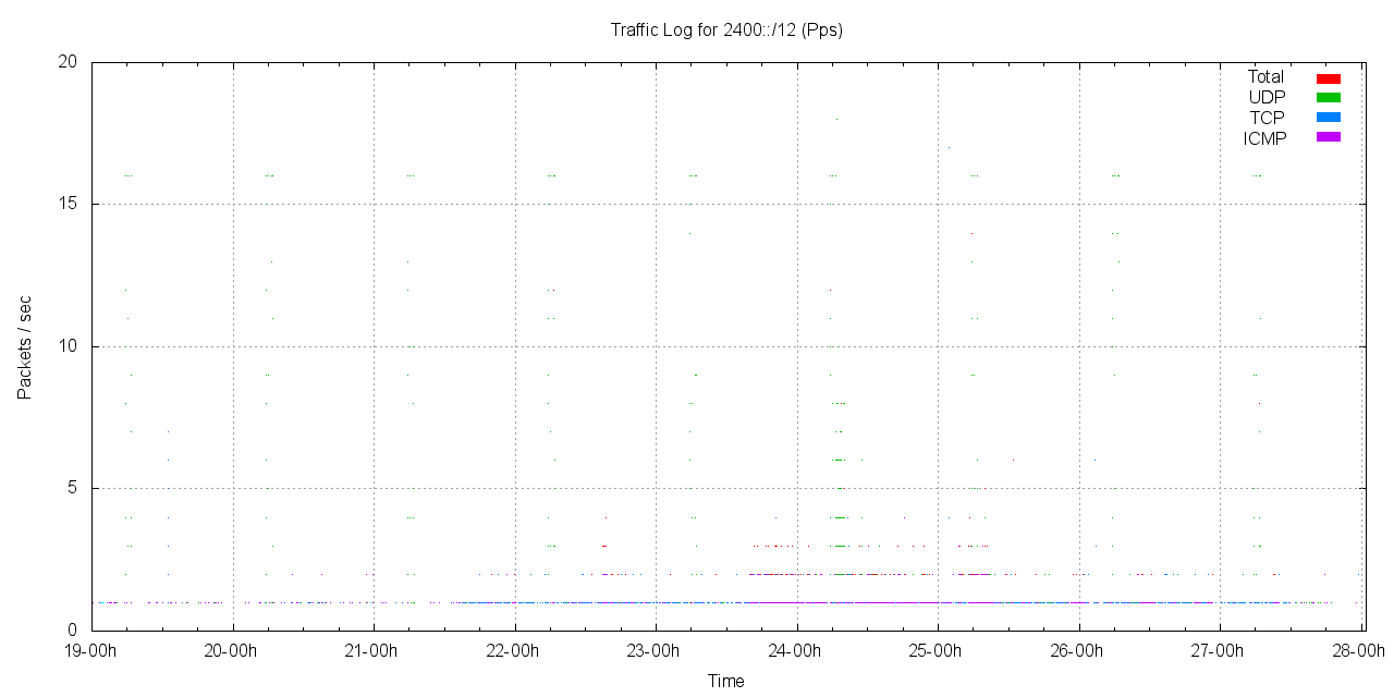 The level of the dark traffic is one packet every 37 seconds across the entire /12. Of the 21,166 packets collected, 7,881 (37%) were ICMP6, 7,660 were TCP (36%) and 5,609 (26%) were UDP. The traffic pattern appears to be sporadic, and very light. The following figure shows the packet rate of traffic directed to this unallocated dark Ipv6 address space in 2400::/12 over the 9 day period.