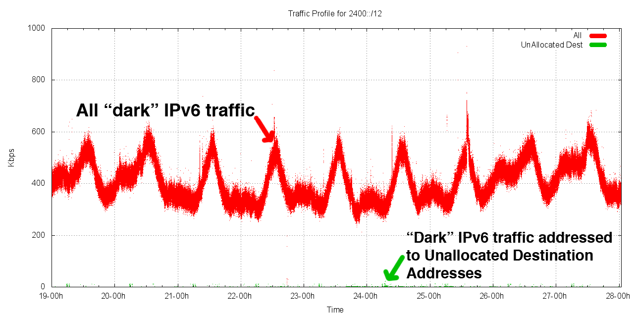 Much of the virus traffic in IPv4 is the result of the virus performing a scan of the address space, probing for new victims. However this rather simple blind probe technique of virus propagation is infeasible in IPv6. So when we look at "dark" address space, we don’t expect to see probe traffic performing a scan of the IPv6 address space.