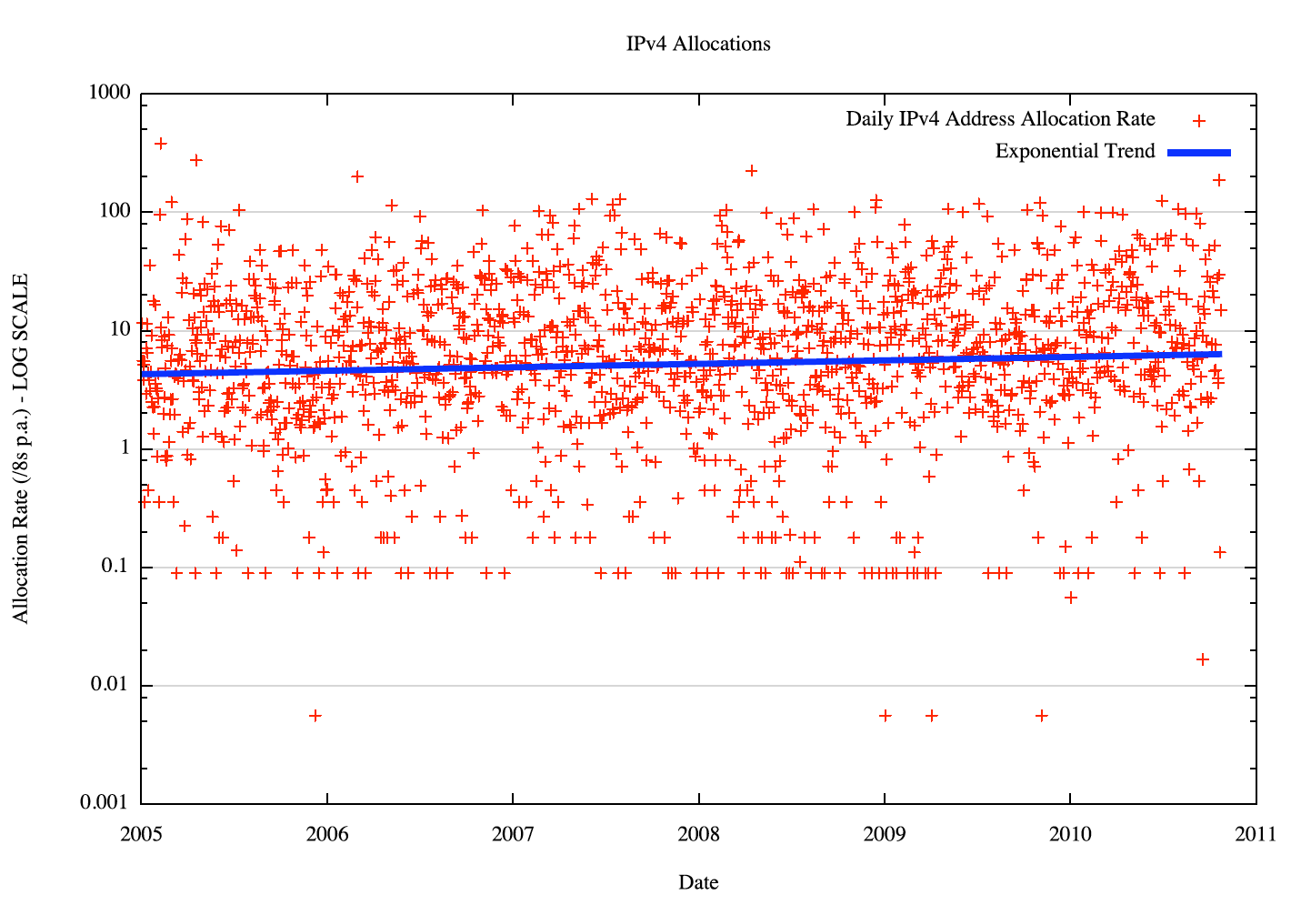 If we want to understand when we are going to run down the address pool then we are not looking at the average of some 7,000 individual allocations per year, but the likely timing of the largest 20 or so transactions each year, and in the time remaining between now and exhaustion of the pool we are looking at the timing of the next 10-20 such large transactions, as they will effectively determine the date when the available address pool is exhausted.
