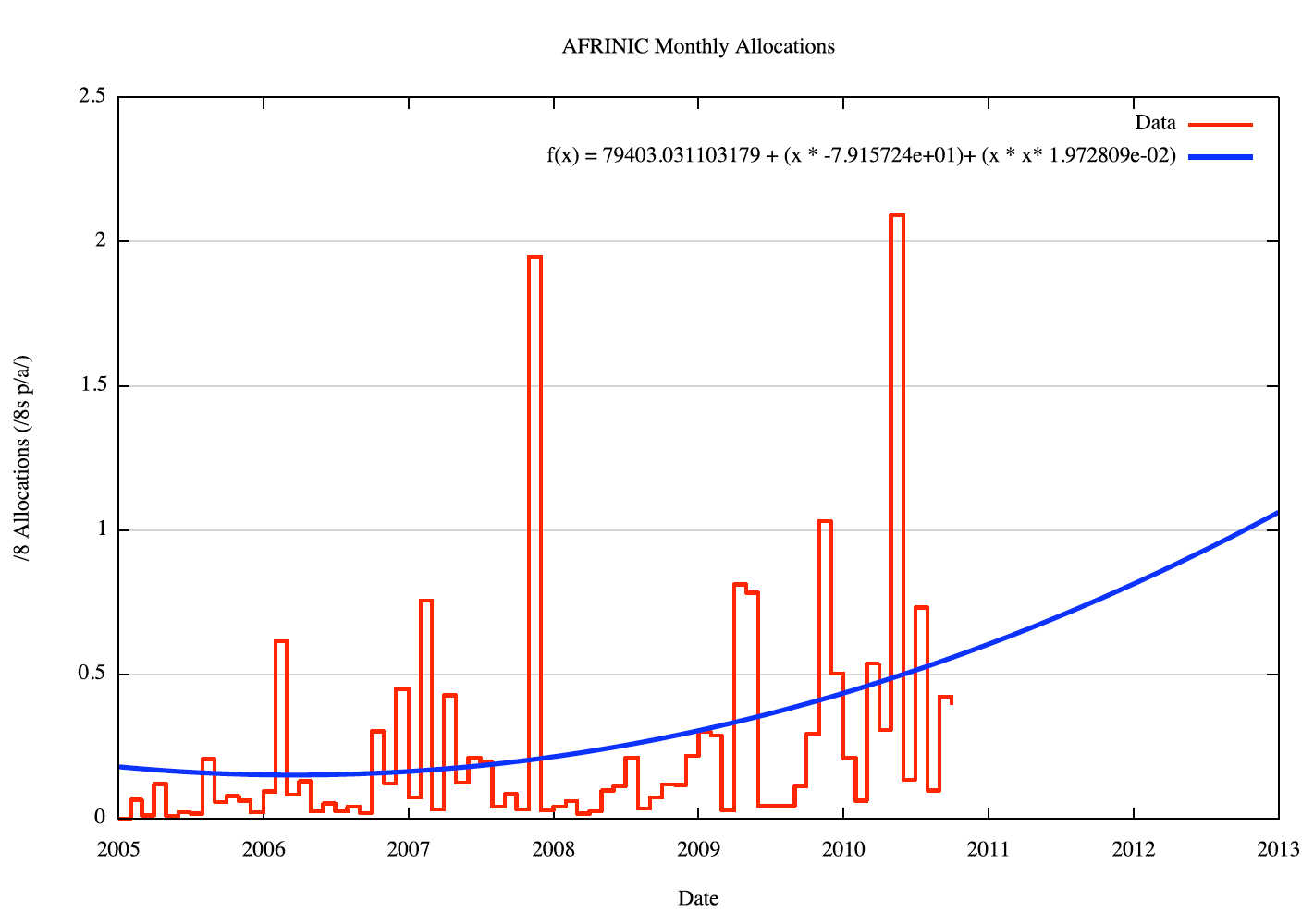 The first step is to create a model of address consumption for each RIR. The same technique as shown above, namely of constructing a base data set of monthly allocations for each RIR, and then linear regression is used to find an O(2) polynomial best fit to the data.