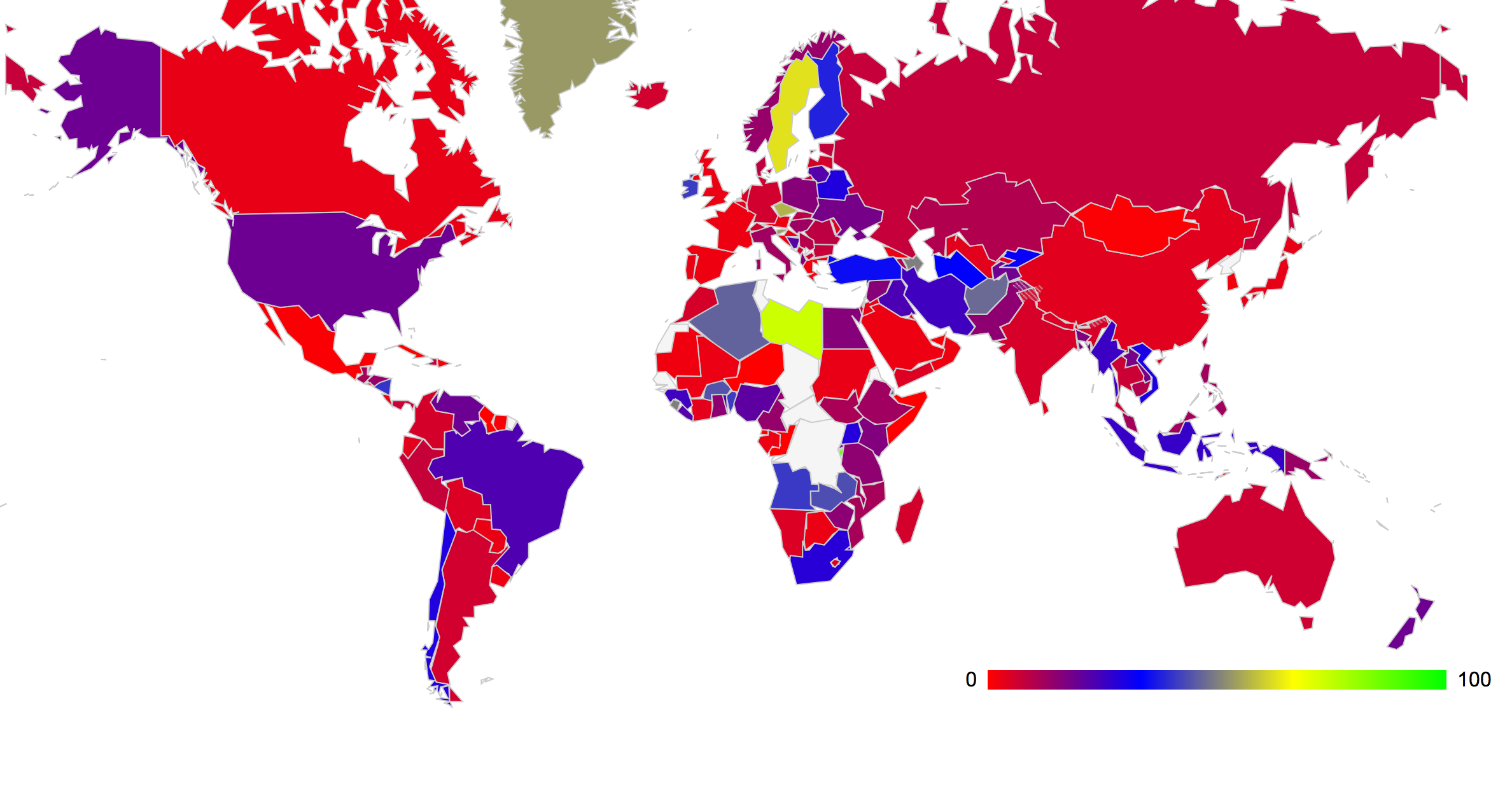 Once again is it possible to feed this data into a map of the world and paint each country with a color that denotes the level of coverage of DNSSEC. This is shown in Figure 3. (The data used to generate this map can be found at http://labs.apnic.net/dnssec/hosts_by_cc.txt)