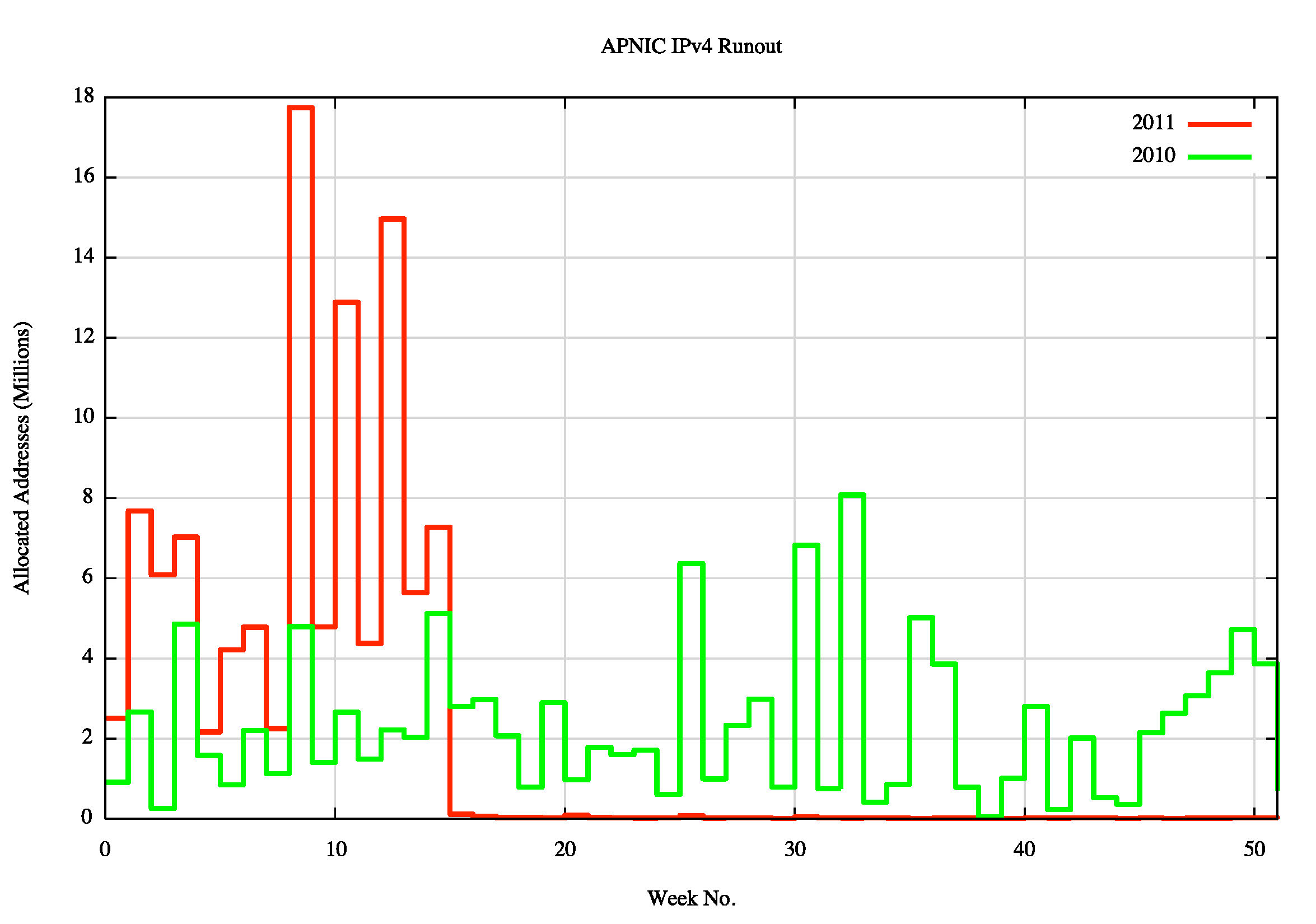 In the Asia Pacific region there was a strong element of panic visible in the address consumption figures for the period January – April 2011. The average number of addresses allocated per week by APNIC across 2010 was some 2.3 million addresses per week, whereas the first 14 weeks of 2011 saw the volume of allocations triple to an average of some 6.9 million addresses per week. Figure 1 shows the week-by-week allocated address volume comparing 2010 (green) with 2011 (red). The surge in address allocations in weeks 8 – 20 in 2011 in APNIC is clearly evident here.