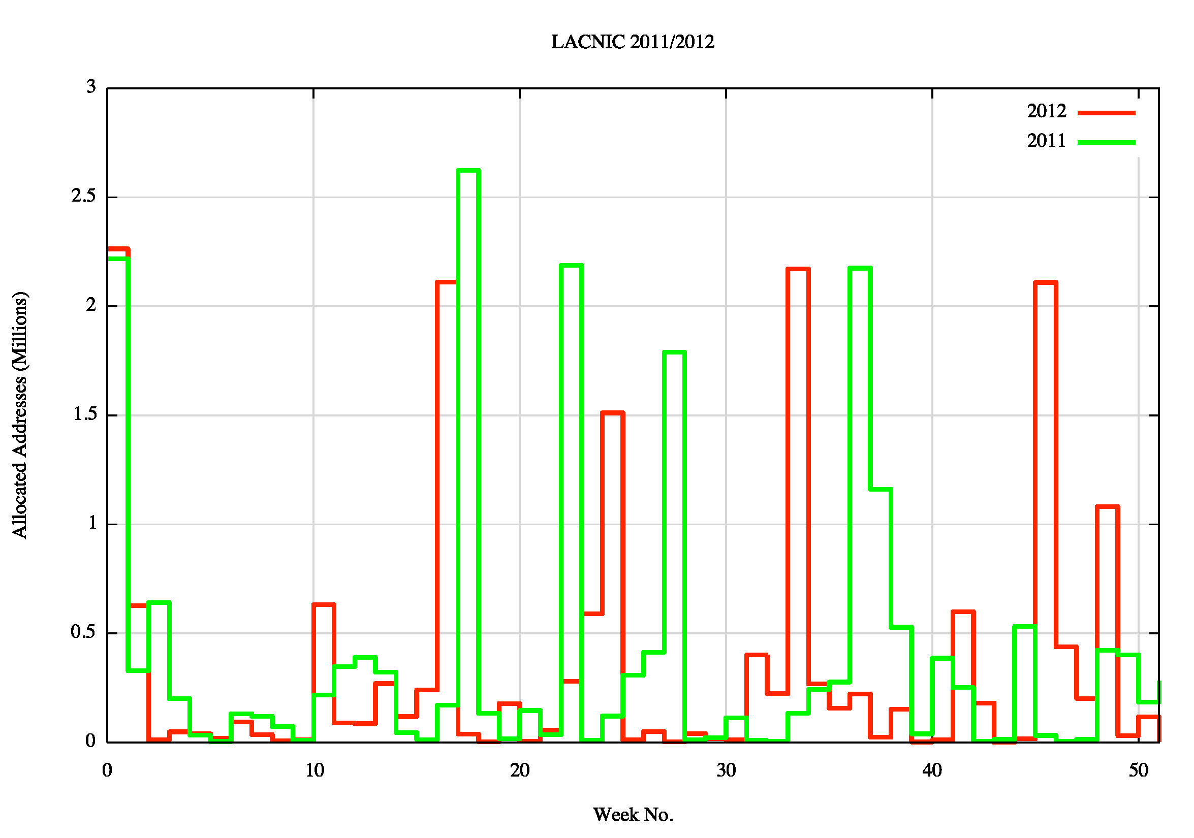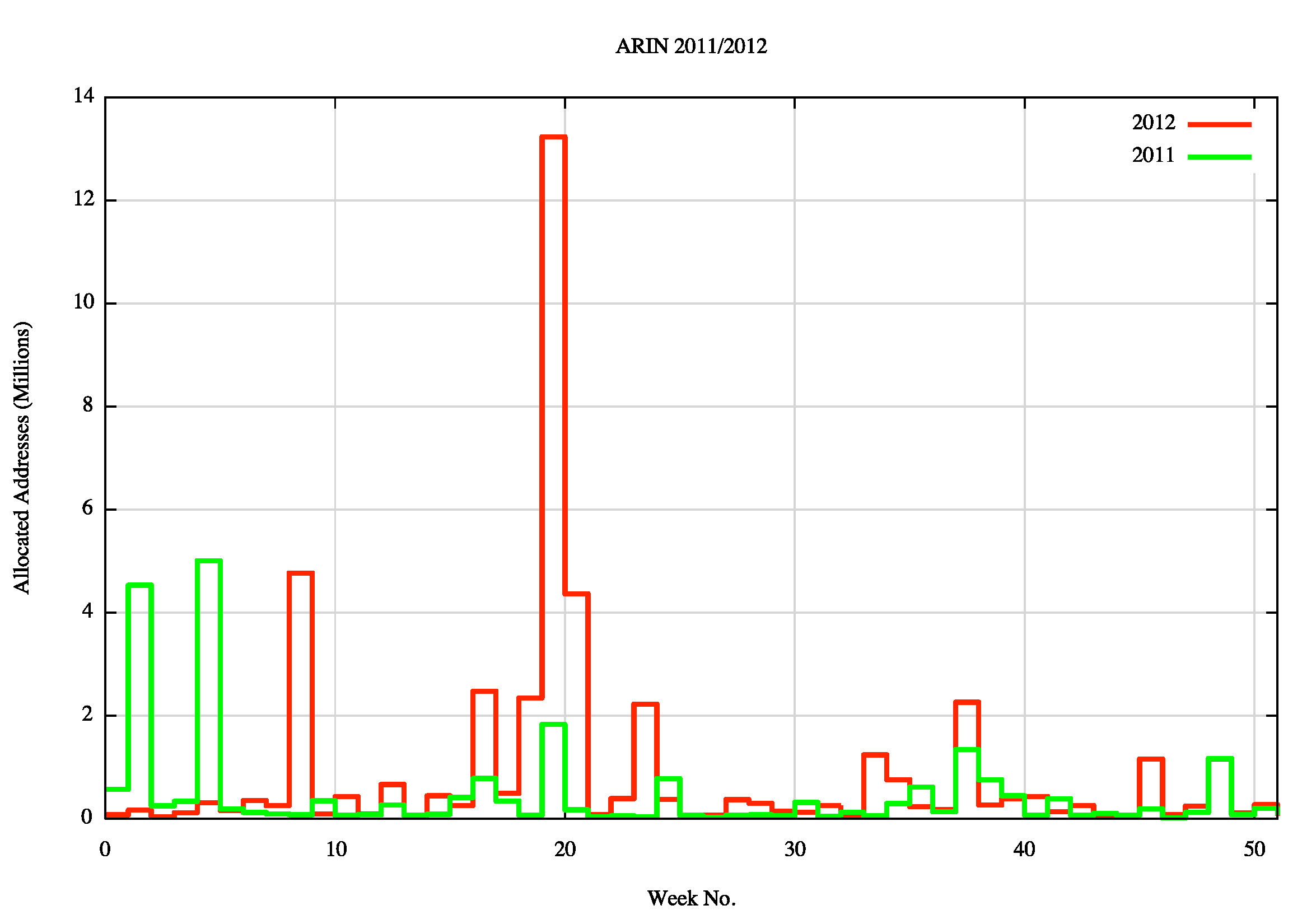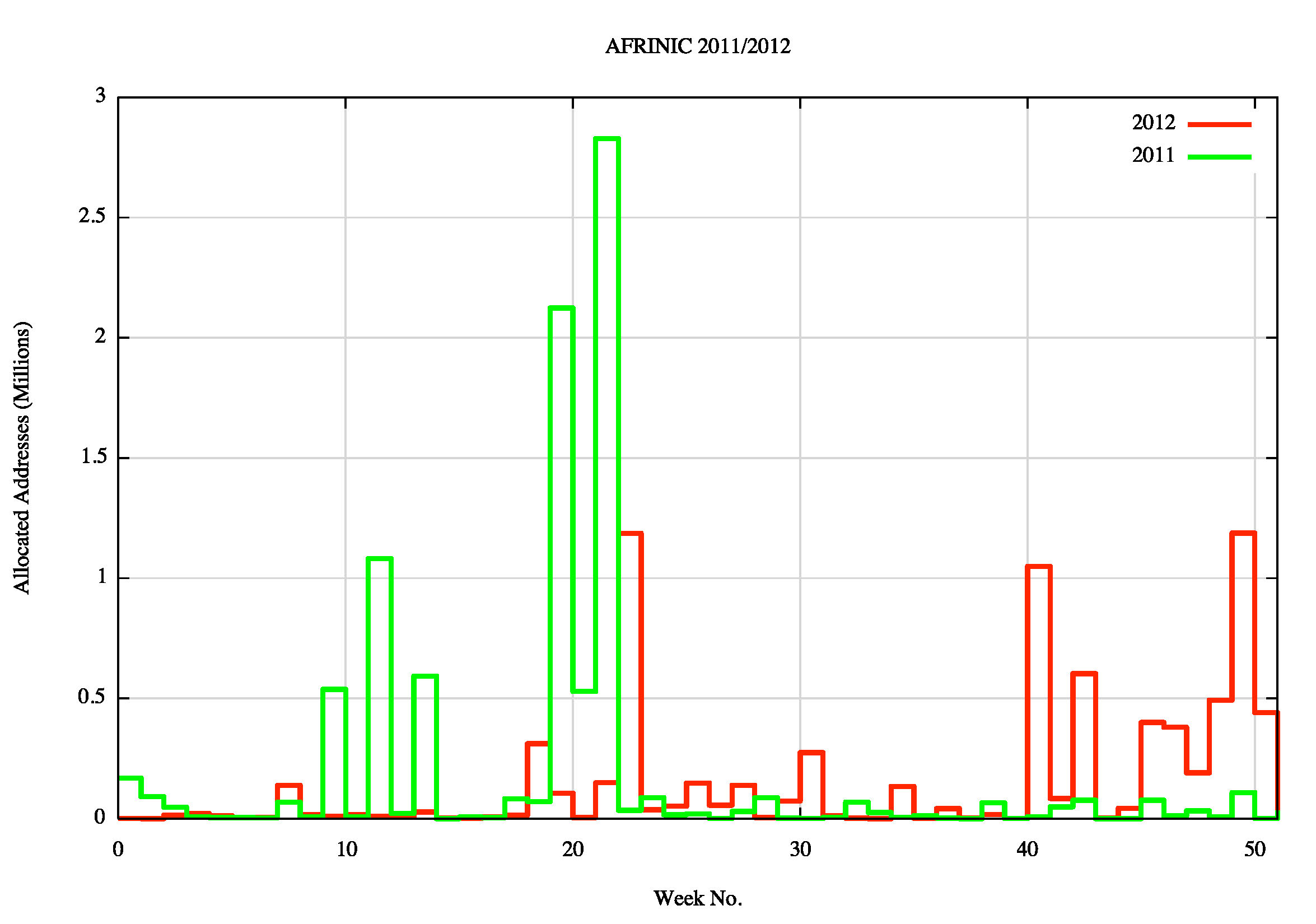 The major notable allocation events in 2012 are a set of allocations totalling some 13 million addresses in week 20 by ARIN, and a rising average allocation rate at AFRINIC at the end of 2012, rising to an average of 0.5 million addresses per week with 2 weeks with more than 1 million allocated addresses. However, there is no clear signs of a "last minute" rush on the three RIRs that still have available IPv4 addresses to distribute.
