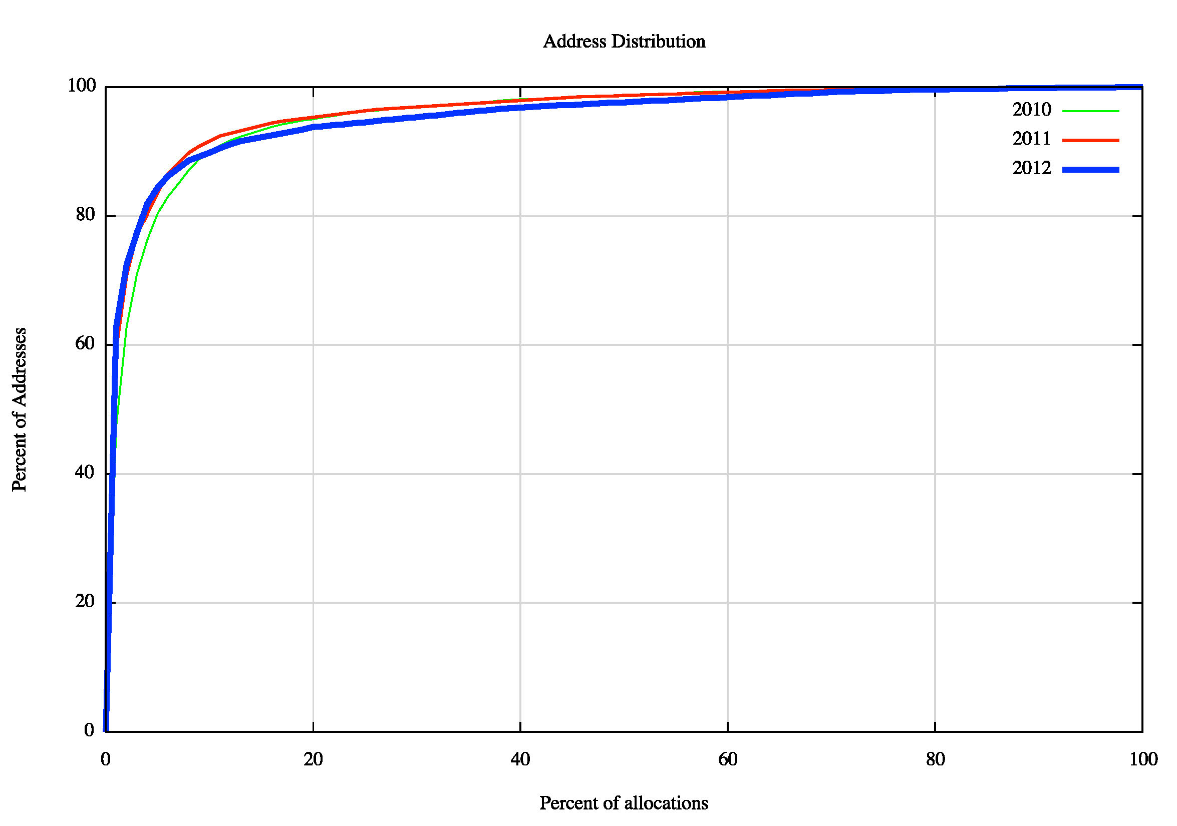 Figure 4 shows the address distribution for 2010 (green), 2011 (red) and 2012 (blue). The shift from 2010 to 2011 showed an increase in the proportion of address space being allocated to the larger providers. The largest 10% of allocations in 2010 received, 89.8% of the total allocated address space, while this rose slightly to 91.6% in 2011. The impact of address exhaustion in APNIC was evident in 2012, as the largest 10% of allocations received 89.8% of all addresses, the same level as 2010.