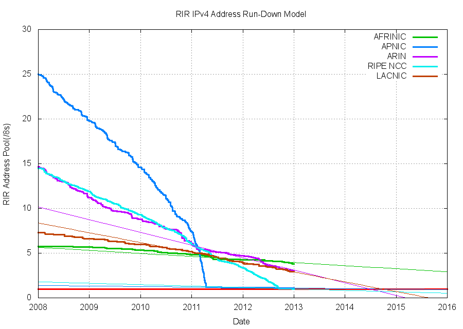The Internet continues to rely very heavily on IPv4, and the consumption of a further 114 million addresses in 2012 leaves 219 million addresses in the pool of unallocated addresses, or a total of some 23 months if we were able to access these addresses at the same rate as we have been to date. However this is not the case.
