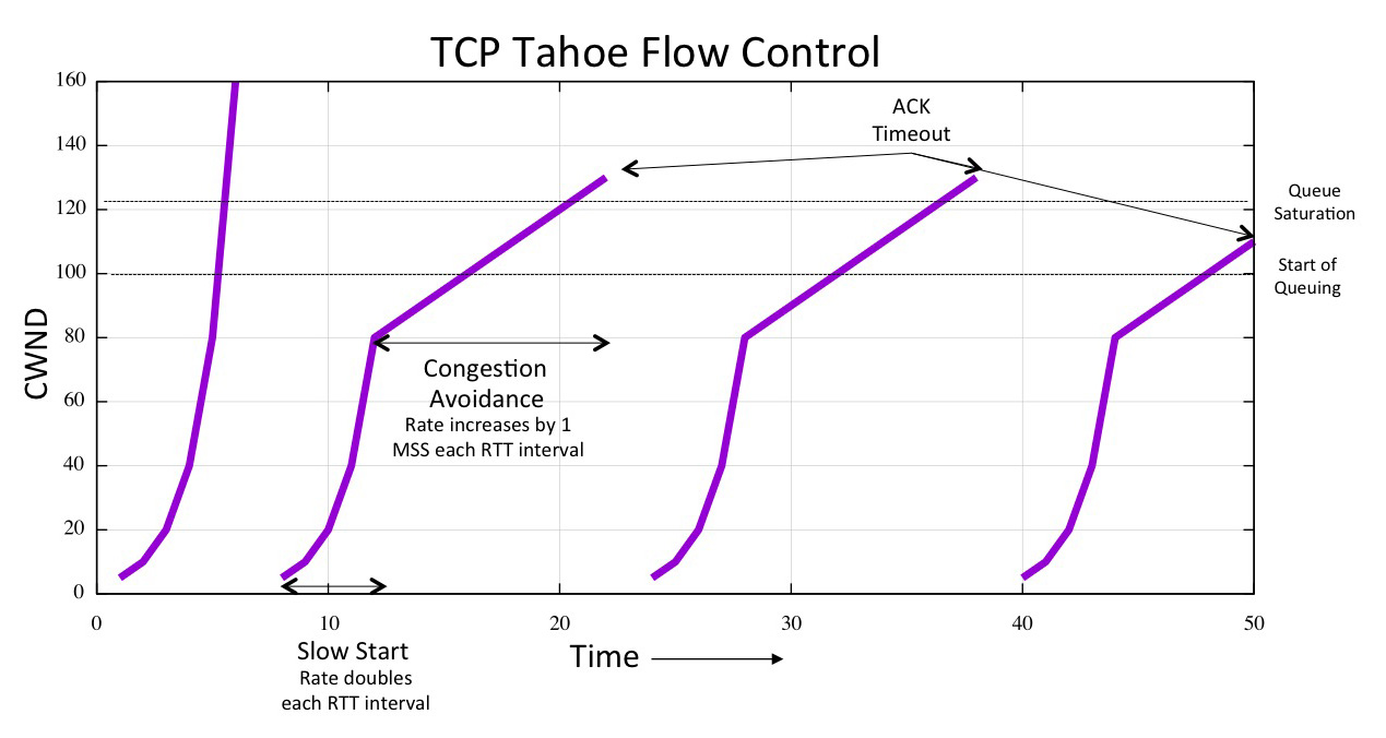 One of the early TCP flow control algorithms was TCP Tahoe, first used in the 4.3BSD operating system. In this flow control framework there are two distinct phases of behaviour: the “Slow Start” phase, where the sending rate is doubled every round trip time (RTT) interval, and a “Congestion Avoidance” phase, where the sending rate is increased by a fixed amount (one Message Segment Size (MSS)) in each RTT interval [5].