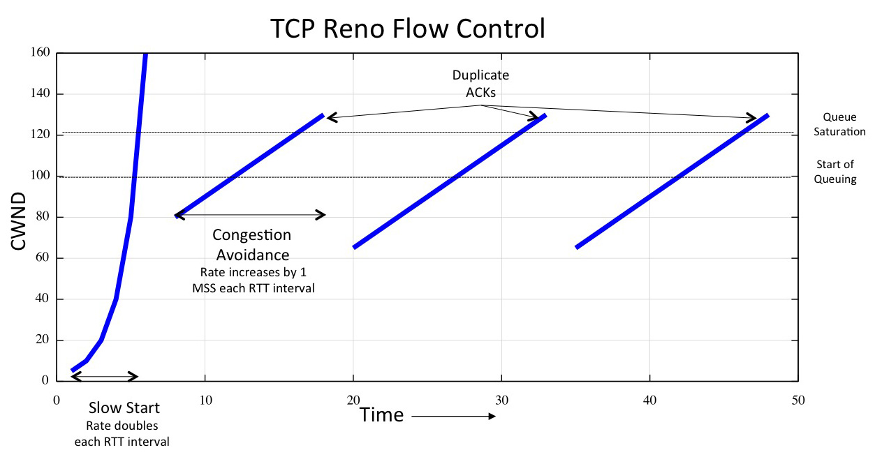 TCP Reno’s AIMD algorithm tends to place high levels of pressure on the buffers in the network while there is still available buffer space, and react less dramatically when the buffers eventually overfill and reach the packet drop point. TCP Reno’s flow control is far more efficient than its Tahoe predecessor, but this is still a “boom and bust” form of feedback control, which attempts to drive the network into congestion overload and then backoff to allow the buffers to drain. Despite these shortcomings Reno has been the mainstay of the Internet for more than a couple of decades, and it remains the benchmark against which other TCP flow control algorithms are compared.