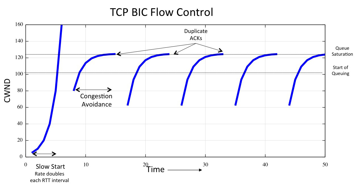 BIC, and its variant CUBIC, use a non-linear increase function rather than a constant rate increase function. Instead of increasing the speed by a fixed amount each RTT in Congestion Avoidance mode BIC remembers the sending rate at the onset of packet drop, and each RTT increases its speed by one half of the difference between the current sending rate and the assumed bottleneck rate. BIC quickly drives the session towards the bottleneck capacity, and then probes more cautiously once the sending speed is close to the bottleneck capacity. (Figure 3) Again, compared to a Reno flow session BIC should produce a superior outcome.
