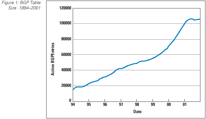 The encouraging news is that there appears to be no immediate cause for concern regarding the capability of BGP to continue to support the load of routing the Internet. The processor and memory capacity in current router platforms is easily capable of supporting the load associated with various forms of operational deployment models, and the protocol itself is not in imminent danger of causing network failure through any internal limitation within the protocol itself. Also, numerous network operators have exercised a higher level of care as to how advertisements are passed into the Internet domain space and, as a result, the growth rates for the routing table over 2001 shows a significant slowdown over the rates of the previous two years (Figure 1).