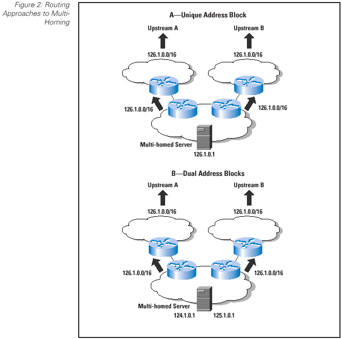 The evolving requirement here is one that must be able to integrate the demands of an increasing use of multi-homing into the overall network design. Two basic forms of approach can be used here—one is to use a single address block across the customer network and announce this block to all transit providers as an unaggregatable routing advertisement into the inter-domain routing system, and the other is to use multiple address blocks drawn from each provider's address block, and use either host-based software or some form of dynamic address translation within the network in order to use a source address drawn from a particular provider's block for each network transaction (Figure 2). The second approach is not widely used, and for the immediate future the requirement for multi-homing is normally addressed by using unique address blocks for the multi-homed network that are not part of any provider's aggregated address blocks. The consequence of this is that widespread use of multi-homing as a means of service resiliency will continue to have an impact on the inter-domain routing system.