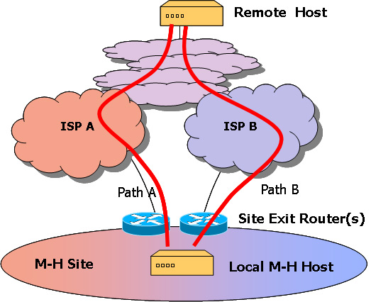 This simple scenario is intended to illustrate the basic multi-homing environment. Variations of this scenario include additional external providers of transit connectivity to the local site, complex site requirements and constraints, where the site may not interface uniformly to all external transit providers and may want to spread traffic across all connections in the normal operational state, sequential rather than simultaneous external transit reachability, where external connections may not all be available at any time, communication with remote multi- homed hosts, multi-way communications of more than two parties, use of third party referrals and the imposition of policy constraints on path selection. However, the basic scenario is sufficient to illustrate the major architectural aspects of support for multi-homing.