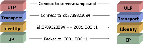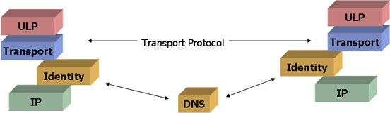 The implication here is that there is an additional layer of indirection in the protocol behavior. While the upper layers of the protocol stack need to maintain a peering based on some concept of an identity that is persistent across at least the session (and possibly longer), the lower levels need to be able to direct packets to each other based on a locator value. This implies that somewhere within the protocol stack there is a need to map between identities and locators.