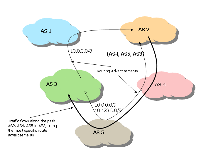 In Figure 1 AS1, originating the route to network 10.0.0.0/8, advertises this prefix as route advertisement that is passed to its adjacent BGP neighbours AS2 and AS3. Both AS2 and AS3 learn the prefix advertisement with an associated path vector of <AS1>. AS2 then advertises this prefix to its neighbour, AS4. AS4 learns of the prefix with an associated path vector of <AS2, AS1>, and so on. AS5 will ultimately learn two announcements for the prefix 10.0.0.0/8, one with a path vector of <AS4, AS2, AS1> and the other with the path vector <AS3, AS1>. AS5 then makes a policy decision as to which route path to accept, which, by default will be the shorter AS path, namely <AS3, AS1>.
